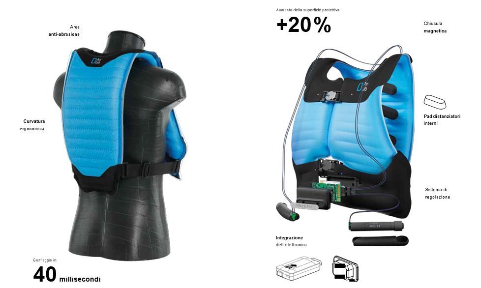 La nostra tecnologia brevettata dell’airbag fa sì che esso sia progettato secondo strutture che lasciano un’ampia apertura utile per il passaggio dell’aria e permettendo così maggior ventilazione e comfort d’uso. All’attivazione, l’airbag si andrà a distendere coprendo interamente il torace e la schiena della persona.